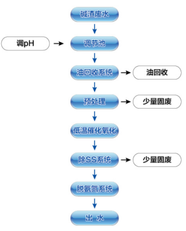 Alkali residue waste water by acid to a certain pH value, through the oil recovery equipment recovery of oil in the oil; After pretreatment of alkali residue wastewater pretreatment to remove part of the COD and improve the COD can be removed, pretreatment wastewater into the low temperature catalytic oxidation system; After the catalytic oxidation technology, the degradation rate of organic matter in alkali residue wastewater is more than 99%, and the volatile phenol and sulfide are reduced to below 30 mg / L. And then by the Division I ammonia system treatment, alkali residue wastewater ammonia nitrogen reduced to below 30mg / L, to meet the requirements of the tube. Custom processing standards can be tailored to customer goals